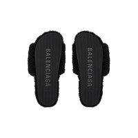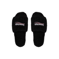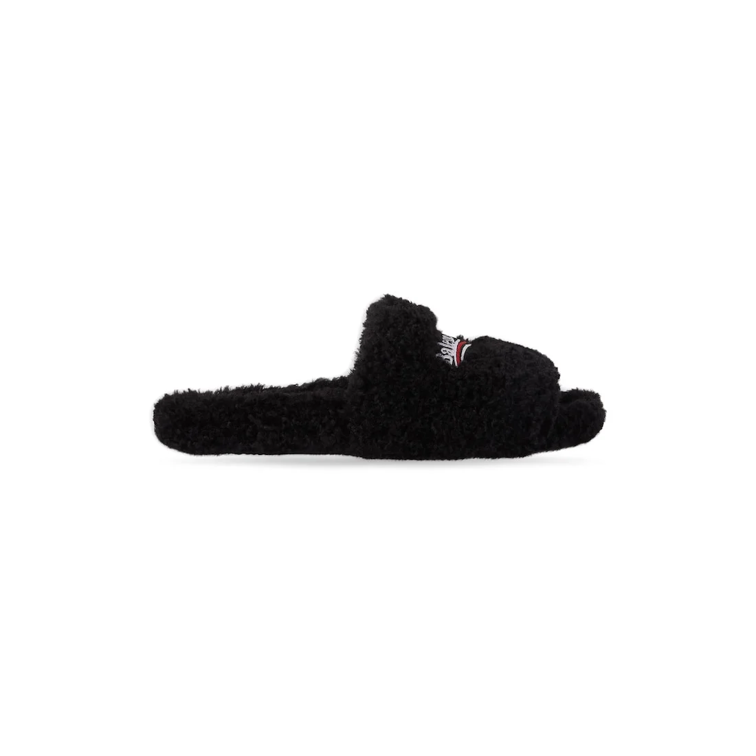 Furry Slide Sandal in black synthetic material, white and red political campaign artwork embroideries PRODUCT DETAILS • Modacrylic and polyester • Slide sandal • Embroidered Balenciaga political campaign artwork • Tone-on-tone sole • Black outsole • Made in Italy Material: modacrylic, other fiber