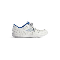 Hamptons Worn-Out Sneaker in white, dark blue and grey cowskin and polyester PRODUCT DETAILS • Cowskin and polyester • Sneaker • Worn-out effect • Scribbled laces • Raw edge and visible stitching on the upper • Balenciaga logo debossed on the upper • Balenciaga logo embossed on the outsole • 3B sports icon artwork in rubber on each side • Loop sports icon logo on the tongue and at back heel • Written size debossed on the upper and at back of the heel • Made in China Upper: cowskin, polyester - Sole: rubber - Insole: foam