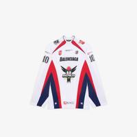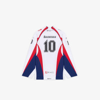 Hockey Long Sleeve T-shirt in white, red and dark blue sporty mesh jersey PRODUCT DETAILS • Sporty mesh jersey • Regular fit • Crewneck • Long sleeves • Hockey artwork printed on front and back • Soccer artwork printed on front • Logo and team number printed on front and back • Made in Portugal • Dry cleaning • Model is 190 cm / 6'2.80" and is wearing a FR size S Material: 100% polyester
