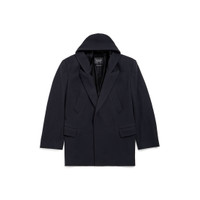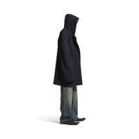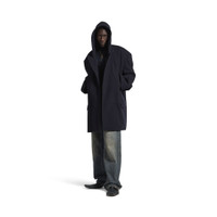 Hooded Short Coat in dark navy brushed wool for Men is from look 27 of Balenciaga Winter 25 Collection. PRODUCT DETAILS • Wool • Hooded • Shoulder pads • Concealed closure • Peak lapel • 2 chest pocket • 2 flap pockets at front • Made in Italy Main material: 100% wool