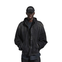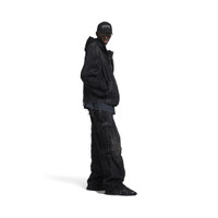 Hooded Workwear Jacket in black cotton denim for Men PRODUCT DETAILS • Cotton denim • Attached hood • Snap and zipper closure • 2 slash pockets at front • Elasticated cuffs • Loop sports icon artwork embroidered at chest • Ripped details, worn-out look • Made in Italy Main material: 100% cotton