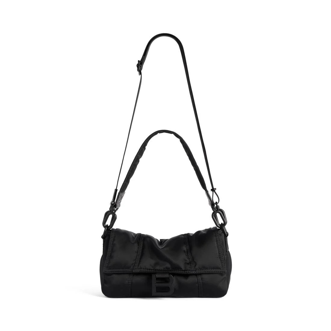 Hourglass Board Bag Small in black nylon, matte black hardware PRODUCT DETAILS • Dimensions: L9,8 x H5,5 x W2,7 inch • Polyamide, polyester and lambskin • Removable shoulder strap (drop: 7,5 inch) • Adjustable and removable crossbody strap (drop: 23 inch) • Matte black B logo hardware • Studded magnet closure • 1 main compartment • 1 inner zipped pocket • 1 flat pocket at back • Polyamide lining • Made in Italy Material: polyamide, polyester, lambskin