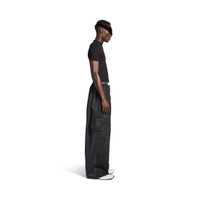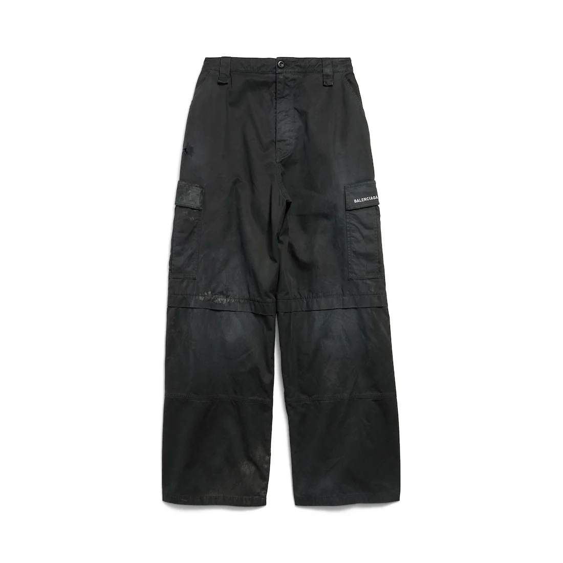 Hybrid Large Fit Pants in black papery twill and navy fleece PRODUCT DETAILS • Papery cotton twill and fleece • Hybrid construction: Cargo pants at front, fleece tracksuit at back • Covered zip fly • 5 belt loops • 2 slash pockets at front • 2 cargo pockets • Balenciaga logo embroidered on left side pocket • Made in Italy Main material 1: 100% cotton