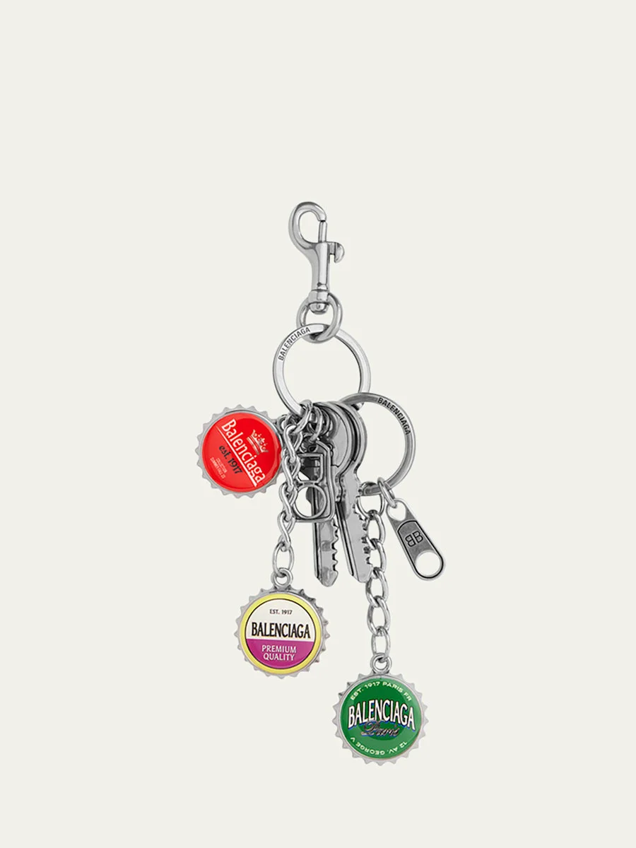 Balenciaga keychain in agedsilver hardware showcasing a playful bottle cap design Approx. 5.9"H x 2.7"W x 0.7"D Can be attached to bags or be used as a keychain Two split rings with charms Balenciaga and bb logo engraved Brass/zamak/steel Made in Italy