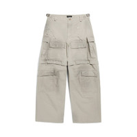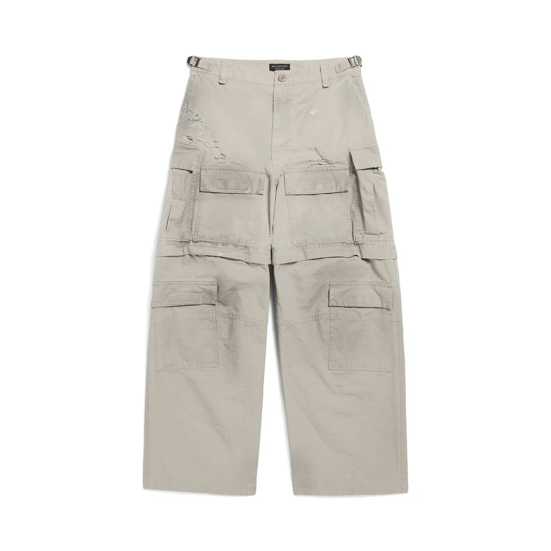 Large Cargo Trousers in beige cotton ripstop are from look 30 of Balenciaga’s Spring 24 Collection. PRODUCT DETAILS • Cotton ripstop • Large fit • Mid-waist • Covered zip fly • 5 belt loops • 2 belt tabs on sides to adjust waistline • 2 slash pockets • 1 cargo pocket on each side • 4 hook and loop patch pockets at front • 2 hook and loop flap pockets at back • 1 zip at knee to remove the bottom • Made in Italy • Dry cleaning • Model is 188 cm / 6'2" and is wearing a size 46 Material: 100% cotton