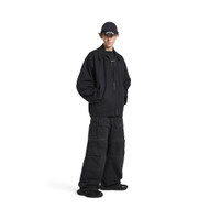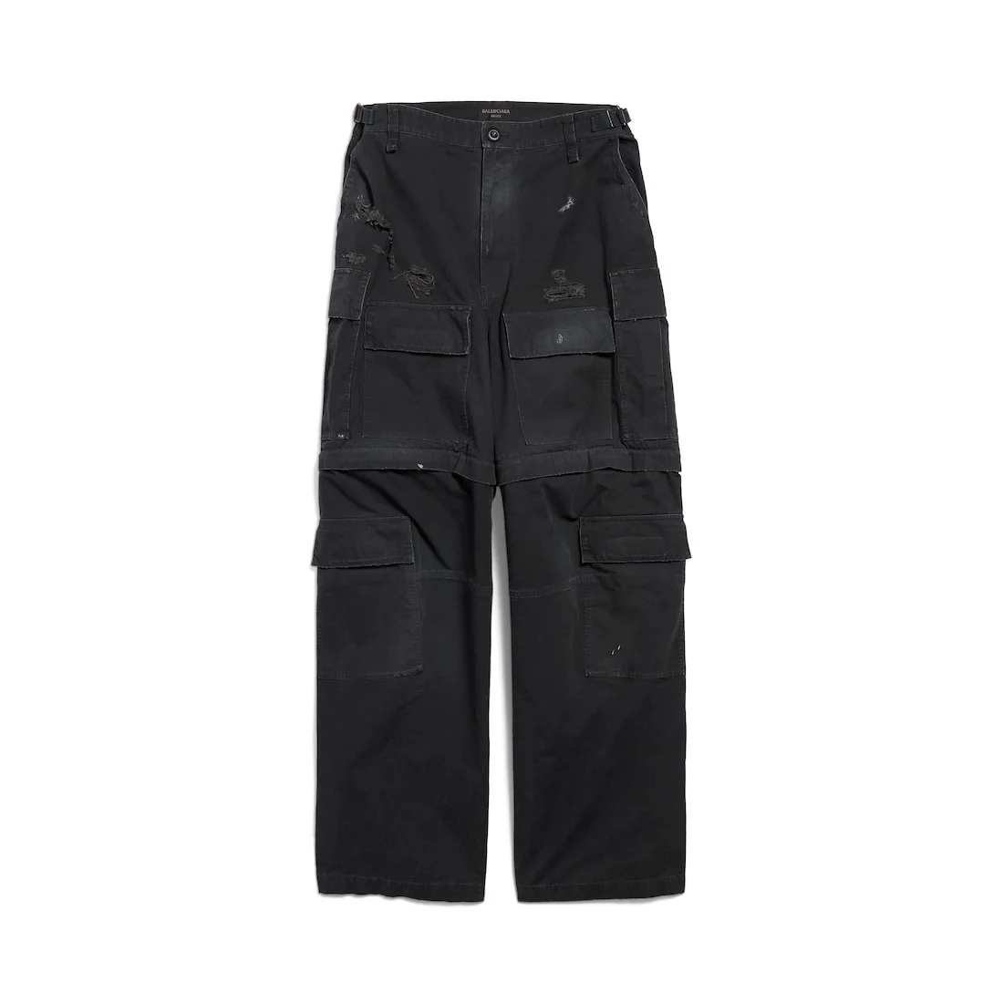 Large Cargo Pants in black cotton ripstop PRODUCT DETAILS • Cotton ripstop • This item is unisex • Large fit • Mid-waist • Covered zip fly • 5 belt loops • 2 belt tabs on sides to adjust waistline • 1 cargo pocket on each side • 4 hook and loop patch pockets at front • 2 hook and loop pockets at back • 1 zip at knee to remove the bottom • Destroyed, washed-out and stained effect • Made in Italy • Dry cleaning • Model is 191 cm / 6'3'' and is wearing a size S Material: 100% cotton