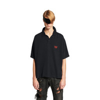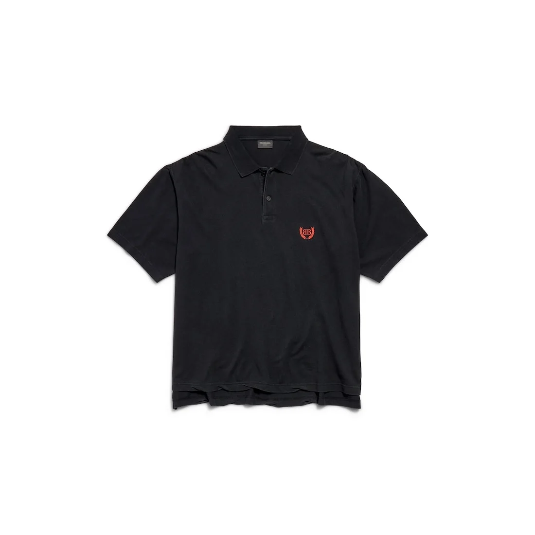 Laurel Classic Short Sleeve Regular Polo in faded black cotton pique PRODUCT DETAILS • Cotton pique • Flat collar • 2 button placket • Short sleeves • Balenciaga engraved buttons • Laurel Classic artwork embroidered at chest • Back longer than the front • Made in Portugal Main material: 100% cotton