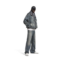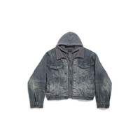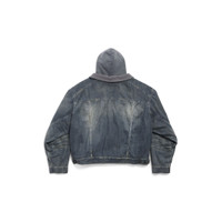 Layered Lined Denim Jacket in blue cotton for Men PRODUCT DETAILS • Cotton denim, dry fleece and terry fleece • Trompe l'œil, layered construction: Denim jacket on hoodie • Panels sewned together • Terry fleece collar • Dry fleece hood with drawstring • Zipped front • 5 decorative button front • 2 chest pockets • 2 slash pockets • Adjustable buttoning at waist • Balenciaga engraved flex buttons • Made in Italy Main material 1: 100% cotton