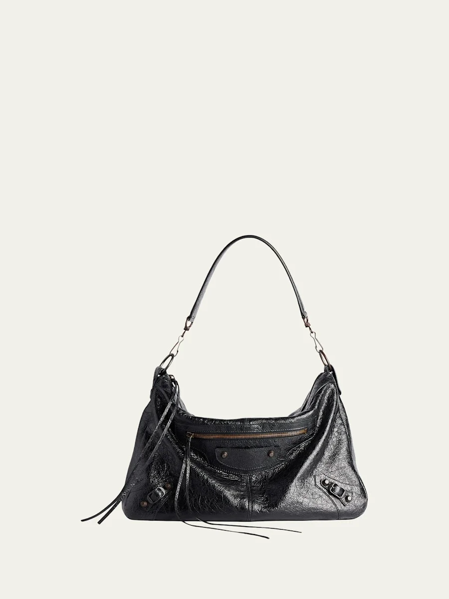 The distinctive texture of Arena Storico lambskin, paired with knotted leather zip pulls, defines the "Le City Moto" bag by Balenciaga. One removable shoulder top strap; 7.8" drop Adjustable and removable shoulder strap; 23.6" drop Can be carried crossbody or over the shoulder Zip closure Exterior, one front zip pocket Interior, one zip pocket, one main compartment Cotton canvas lining Brass hardware Approx. 10.2"H x 15.3"W x 6.3"D Please note that the bag is sold without charms Made in Italy