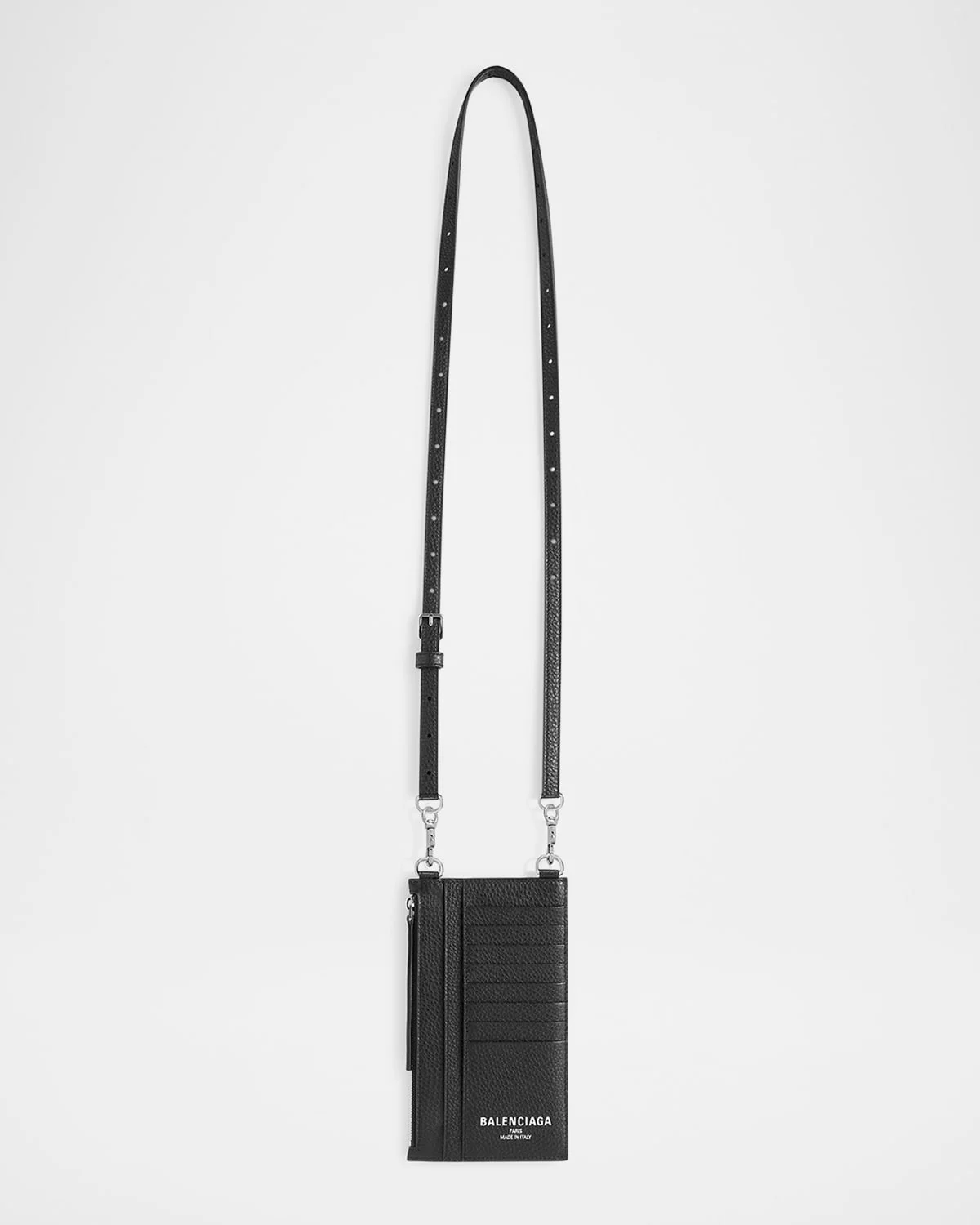 Balenciaga card holder in grained calfskin defined by the paris logo debossed with silver foil on the front Phone holder to fit iPhone 16 Pro Max Detachable adjustable strap Agedsilver hardware One zip compartment Eight card slots Two flat pockets One back slip pocket Approx. 7.2"H x 4.1"W x 0.4"D Made in Italy