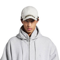 Masking Tape Cap in dirty white cotton drill is from look 22 of Balenciaga's Spring 26 Collection. PRODUCT DETAILS • Cotton drill • Classic baseball cap shape • Ventilation eyelets embroidered on top • Adjustable hook and loop tab at back • Visor cut out on both sides • Masking tape artwork at front • Made in Italy Main material: 100% cotton