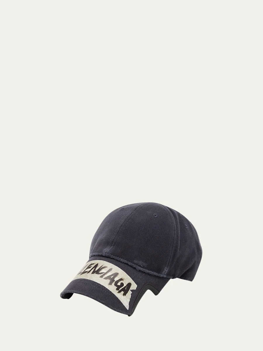 This Balenciaga distressed baseball cap is defined by a curved brim depicting the iconic logo on masking tape. Sixpanel construction Embroidered eyelets Curved brim with angled side cutouts Adjustable back strap Cotton Made in Portugal