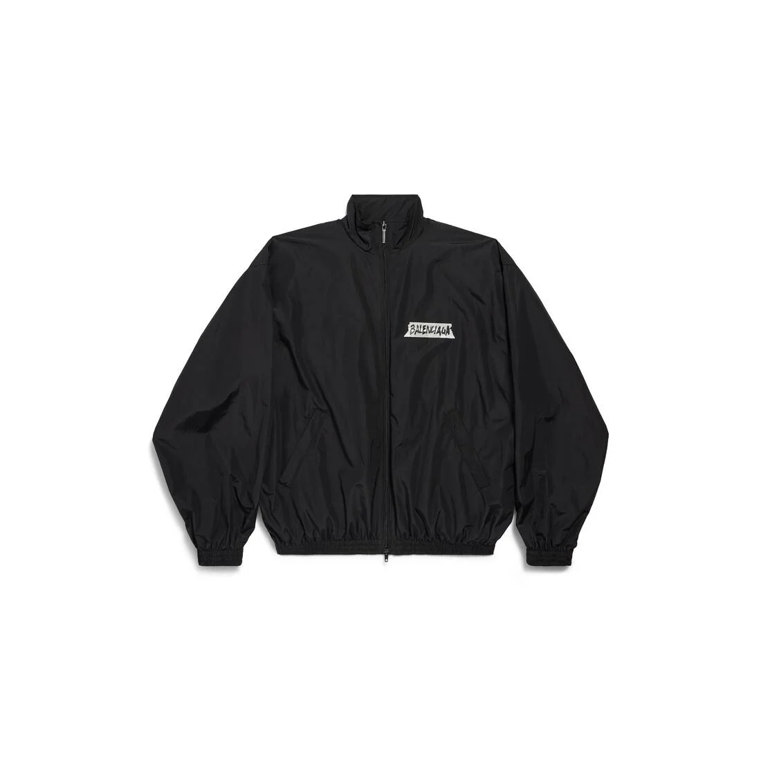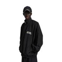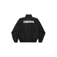 Masking Tape Tracksuit Jacket Medium Fit in black techno cotton poplin PRODUCT DETAILS • Techno cotton poplin • Double-ended zip fastening • Long sleeves • 2 zipped slash pockets • Gathered at cuffs and waistline • Masking tape artwork at chest and back • Made in Italy Main material: 50% cotton, 50% polyamide