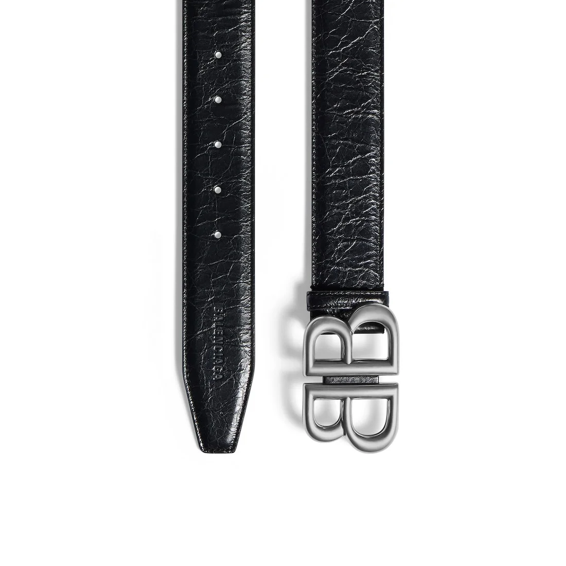 Monaco Belt in black Arena calfskin, aged-silver hardware PRODUCT DETAILS • Dimensions: Width: 1,6 inch • Arena calfskin • Balenciaga logo embossed tone-on-tone at end tip • Aged-silver BB logo hardware • 20 notches on the belt • Tone-on-tone leather loop • Made in Italy • Wipe with a soft cloth Material: 100% calfskin