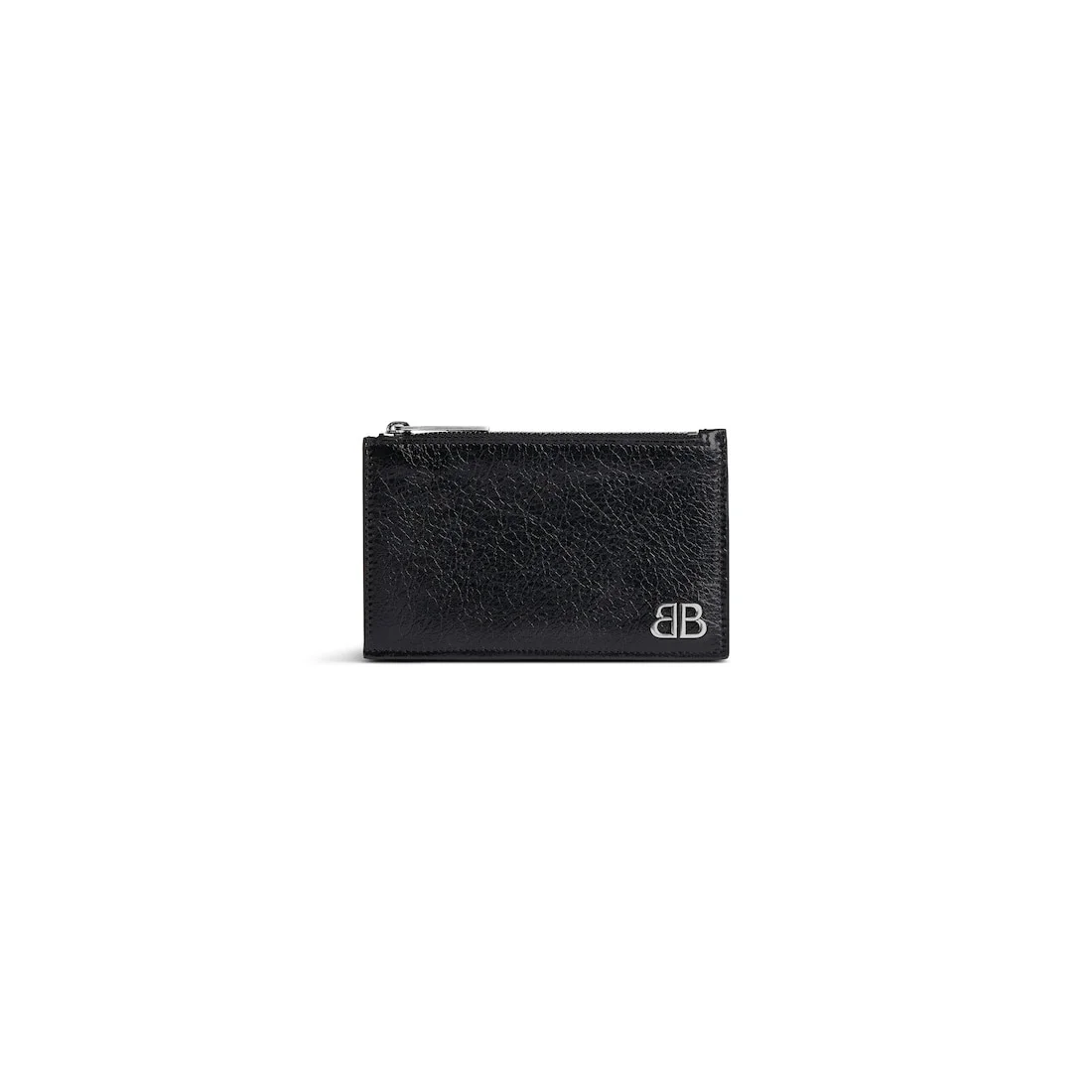 Monaco Long Coin And Card Holder in black Arena lambskin PRODUCT DETAILS • Dimensions: L5,3 x H3,1 x W0,2 inch • Arena lambskin • Long coin and card holder • Aged-silver BB logo hardware • 1 zipped coin pouch • 1 receipt compartment • 5 card slots • Made in Italy • Wipe with a soft cloth Material: 100% lambskin