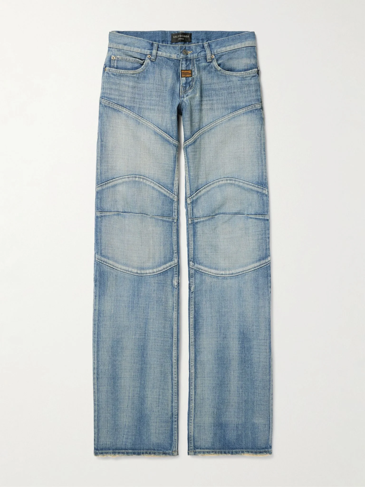 Balenciaga's jeans have a panelled design referencing biker styles. Cut from faded denim, they sit low on the hips and have a branded patch stitched to the fly. Size & Fit - Fits true to size. Take your normal size - Relaxed-straight leg, mid-rise style - Mid-weight, non-stretchy fabric - Model is shown wearing a M - Model measures: waist size 32, height 6'1"/ 185cm Details & Care - Blue denim - Button and zip fastening - 100% cotton - Machine wash