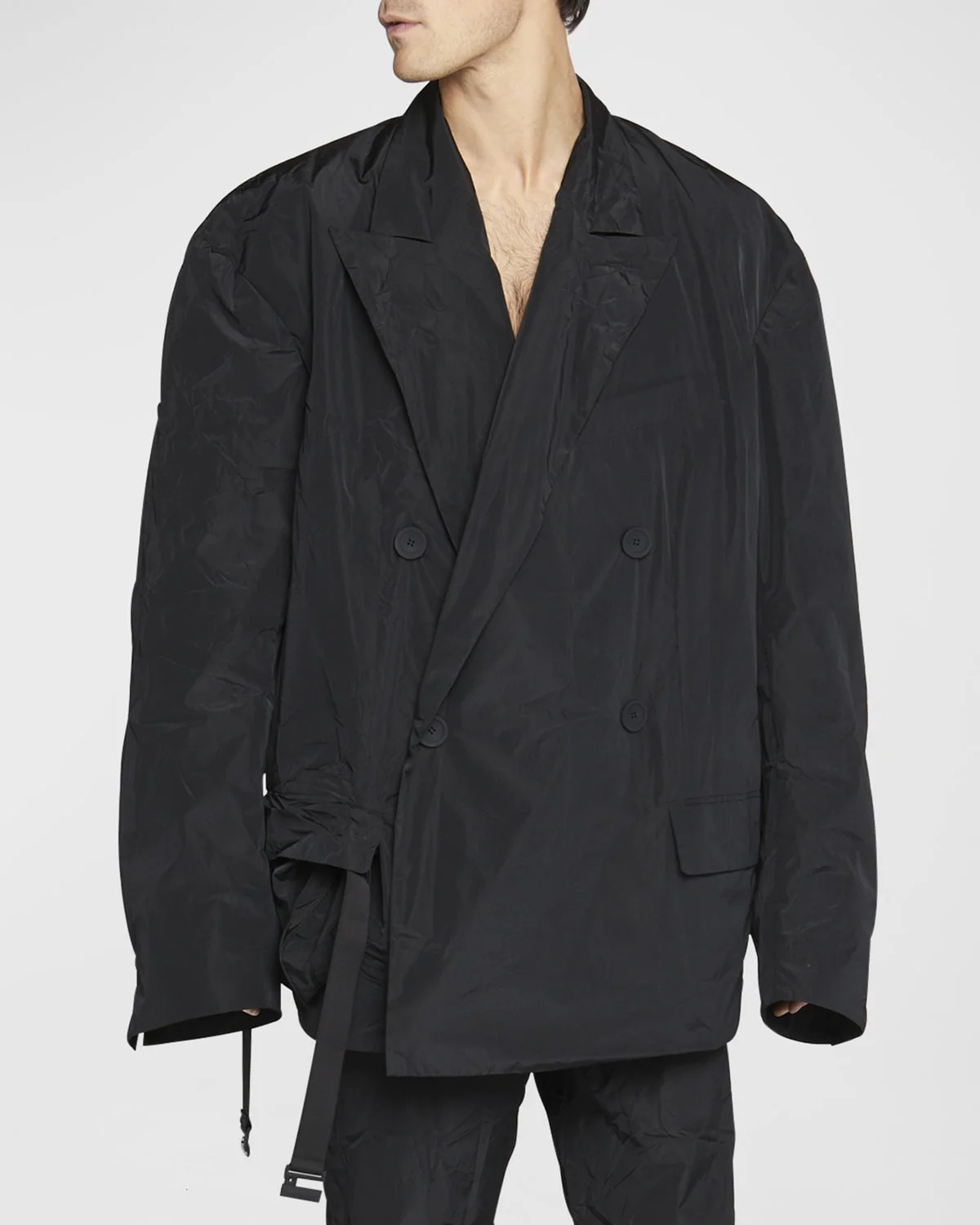 Balenciaga packable jacket in solid taffeta Peak lapels; double-breasted button front Chest welt pocket Side flap pockets Pouch with elasticated belt Oversized fit Long sleeves; button cuffs Polyester Dry clean Made in Portugal