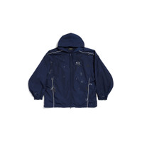 Painter Tracksuit Jacket in navy techno poplin PRODUCT DETAILS • Painter techno poplin • Hood with drawstring • Double-ended zip fastening • Long sleeves • Contrasting yokes • 2 zipped slash pockets • Gathered at cuffs and waistline • Loop sports icon artwork embroidered at chest • Made in Italy Main material: 50% cotton, 50% polyamide