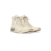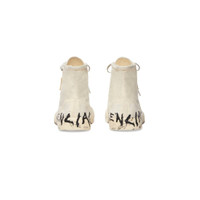 Paris High Top Graffiti Sneaker in white and black destroyed cotton and rubber PRODUCT DETAILS • Destroyed cotton and rubber • Sneaker • Dirty effect • Balenciaga Graffiti logo in color contrast at back • Balenciaga logo printed at the edge of the toe • Embossed size at back • 8 eyelets lace-up vamp • Vulcanized sole • Made in China • Wipe with a soft cloth Material: 100% cotton