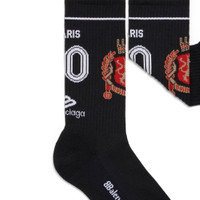 Paris Soccer Socks in black cotton PRODUCT DETAILS • Cotton • Crew socks • Easy care • Breathable fabric • Labelled left and right on the outside • Football crest artwork jacquard at front • 3B sports icon artwork jacquard at back • Paris soccer artwork jacquard at back • BB corp logo under foot • Made in Portugal • Cold machine wash Material: 80% cotton, 18% polyamide, 2% elastane