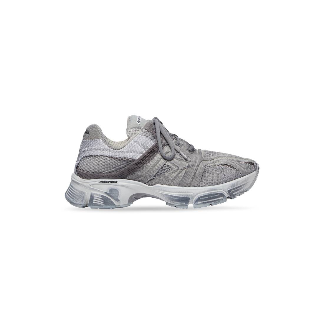 Phantom Sneaker in grey and light grey bicolor fabric and mesh PRODUCT DETAILS • Leather free • Sneaker • Bicolor fabric and mesh • Washed effect • Debossed size at the edge of the toe • Phantom logo attached to the shoe tongue • Balenciaga logo printed on exterior • Balenciaga logo on front outsole • Phantom logo on exterior sole • Balenciaga logo embroidered at the back of the heel • Made in Italy • Wipe with a soft cloth Material: 100% polyamide