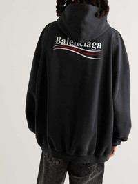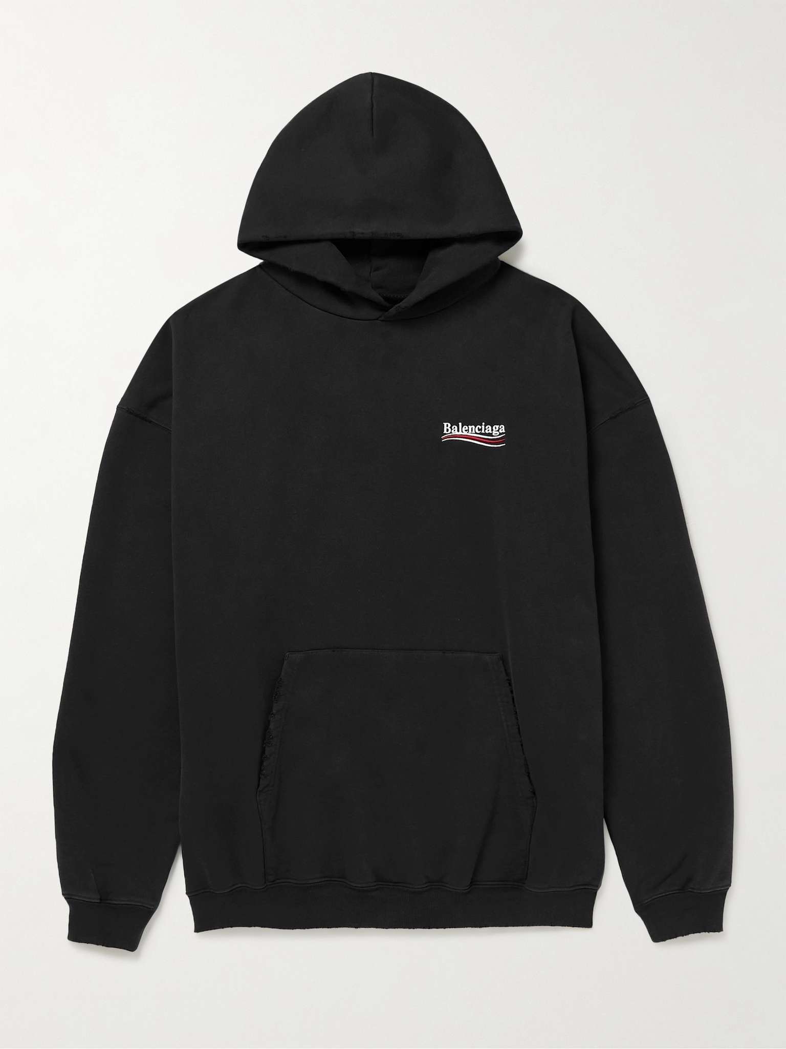 Balenciaga is synonymous with exaggerated proportions - it’s the easy coolness of the brand's staples that keeps fans coming back. This hoodie is made from comfortable cotton-jersey that's lightly distressed to emulate styles that have seen years of love. It's embroidered with a logo in contrasting threads. Size & Fit - Fits true to size. Take your normal size - Designed for an oversized fit - Weighted, slightly stretchy fabric - Model is shown wearing a S - Model measures: chest 36"/ 92cm, height 6'0"/ 183cm Details & Care - Black loopback cotton-jersey - Drawstring hood, front pouch pocket, distressing - 100% cotton; trim: 100% polyester - Machine wash