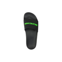 Pool Slide Sandal in black rubber PRODUCT DETAILS • Rubber • Slide Sandal • Molded rubber footbeds • Neon green 3D logo on the strap • Debossed Balenciaga logo on inner sole • Tone-on-tone sole and insole • Cemented assembly process • Made in Italy • Wipe with a soft cloth Material: 100% rubber