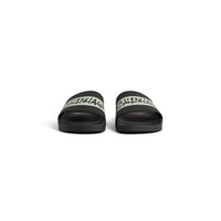 Pool Slide Sandal in black and white rubber PRODUCT DETAILS • Rubber • Slide sandal • Molded rubber footbeds • Balenciaga masking tape artwork on the strap • Tone-on-tone sole and insole • Made in Italy Upper: polyurethane, TPU - Sole: polyurethane, TPU - Insole: polyurethane, TPU
