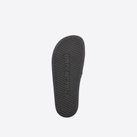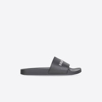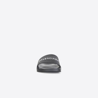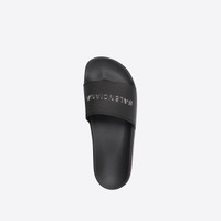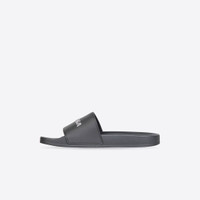 Pool Slide Sandal in black rubber PRODUCT DETAILS • Rubber • Slide Sandal • Molded rubber footbeds • Silver chrome Balenciaga logo on the strap • Tone-on-tone sole and insole • Made in Italy • Wipe with a soft cloth Material: 100% rubber