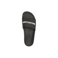 Pool Slide Sandal in black rubber with white 3D Balenciaga logo PRODUCT DETAILS • Slide sandal • Molded rubber footbeds • 3D Balenciaga logo on the strap • Debossed Balenciaga logo under the sole • 20 mm arch • Made in Italy • Wipe with a soft clean cloth Material: 100% TPU