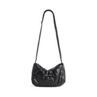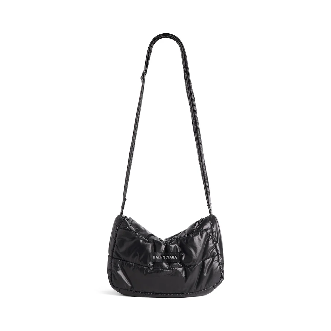 Puffer Crossbody Bag in black nylon micro ripstop, matte black hardware PRODUCT DETAILS • Polyamide and polyurethane • Water repellent • Hobo bag • One shoulder strap • Shoulder carry • Balenciaga logo patch at front • Matte black hardware • Snapped and zipped closure • 1 main compartment • 1 inner zipped pocket • Polyamide lining with BB Balenciaga logo jacquard • Made in Italy Material: polyamide, polyurethane