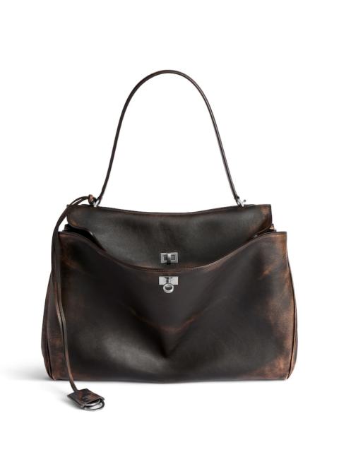 Rodeo Handbag Large in light brown and dark brown bitonal used effect calfskin, aged-silver hardware PRODUCT DETAILS • Dimensions: L15,7 x H11,8 x W5,1 inch • Bitonal used effect calfskin • Handbag • One handle (drop: 9 inch) • Removable shoulder strap (drop: 22,4 inch) • Removable cloche cles with two split rings • Aged-silver hardware • Turn lock closure • Wide front pocket • 1 main compartment • 1 inner zipped pocket • 2 flat pockets at back • Side snaps • 4 brass feet • Nappa lambskin lining • Made in Italy Material: calfskin, polyester