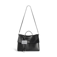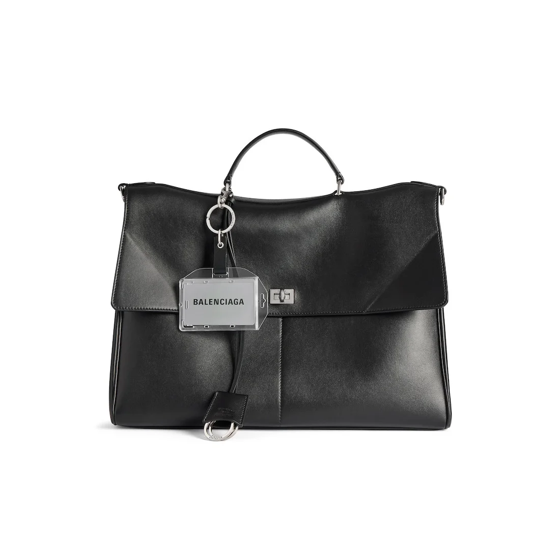 Rodeo Portfolio Bag in black smooth calfskin with aged-silver hardware is from look 24 of Balenciaga Fall 25 Collection. PRODUCT DETAILS • Dimensions: L15,3 x H11,4 x W4,3 inch • Smooth calfskin • One handle • Adjustable and removable webbing strap (drop: 22,8 inch) • One additional leather strap (drop: 22,8 inch) • Crossbody, shoulder and hand carry • Removable cloche cle with two split rings • 1 card holder charm • Aged-silver hardware • Turn lock closure • 2 inner flat pockets • 1 main compartment • 1 inner pocket with snap closure • Side snap • Back zipped pocket • Synthetic material and Nappa lambskin lining • Made in Italy Material: calfskin, polyester, brass, plastic, zamak, stainless steel