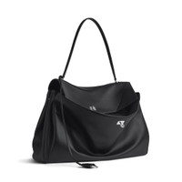 Rodeo XL Handbag in black smooth calfskin, aged-silver hardware PRODUCT DETAILS • Dimensions: L18,9 x H6,7 x W13,8 inch • Smooth calfskin • One handle (drop: 11,8 inch) • Removable shoulder strap (drop: 22 inch) • Crossbody, shoulder and hand carry • Removable cloche cles with two split rings • Aged-silver hardware • Turn lock closure • Wide front pocket • 1 main compartment • 1 inner zipped pocket • 2 flat pockets at back • Side snaps • 4 brass feet • Nappa lambskin lining • Made in Italy Material: calfskin