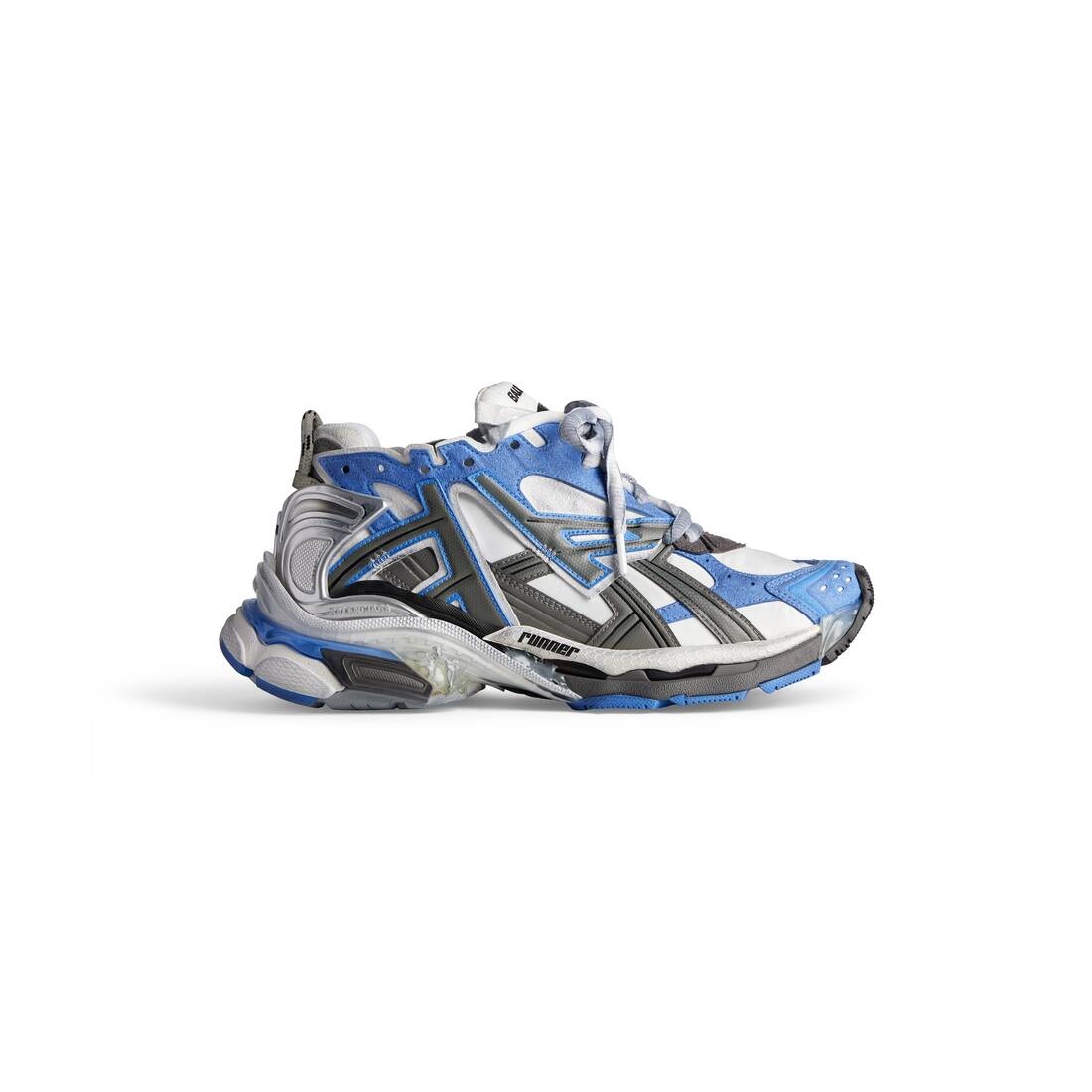 Runner Sneaker in blue, white and grey nylon and suede-like fabric PRODUCT DETAILS • Leather free • Sneaker • Nylon and suede-like fabric • Worn-out effect • Printed size at the edge of the toe • Embossed size at back • Runner logo printed on exterior • Balenciaga logo embroidered on the tongue • Balenciaga logo at the back of the heel • Back pull-on tab • Made in China • Wipe with a soft cloth Material: 57% polyurethane, 43% polyester