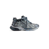 Runner Sneaker in grey, navy and light blue polyurethane and polyester PRODUCT DETAILS • Leather free • Sneaker • Polyurethane and polyester • Worn-out effect • Printed size at the edge of the toe • Debossed size at back • Runner logo printed on exterior • Balenciaga logo embroidered on the tongue • Balenciaga logo at the back of the heel • Back pull-on tab • Made in China Upper: polyurethane, polyester - Sole: rubber, TPU, EVA, polyurethane - Insole: foam