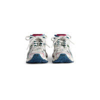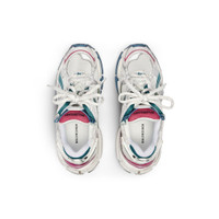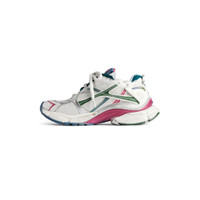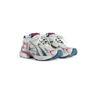 Runner Sneaker in white, dark green, blue and pink polyurethane and polyester PRODUCT DETAILS • Leather free • Sneaker • Polyurethane and polyester • Worn-out effect • Printed size at the edge of the toe • Debossed size at back • Runner logo printed on exterior • Balenciaga logo embroidered on the tongue • Balenciaga logo at the back of the heel • Back pull-on tab • Made in China Upper: polyurethane, polyester - Sole: rubber, TPU, EVA, polyurethane - Insole: polyester
