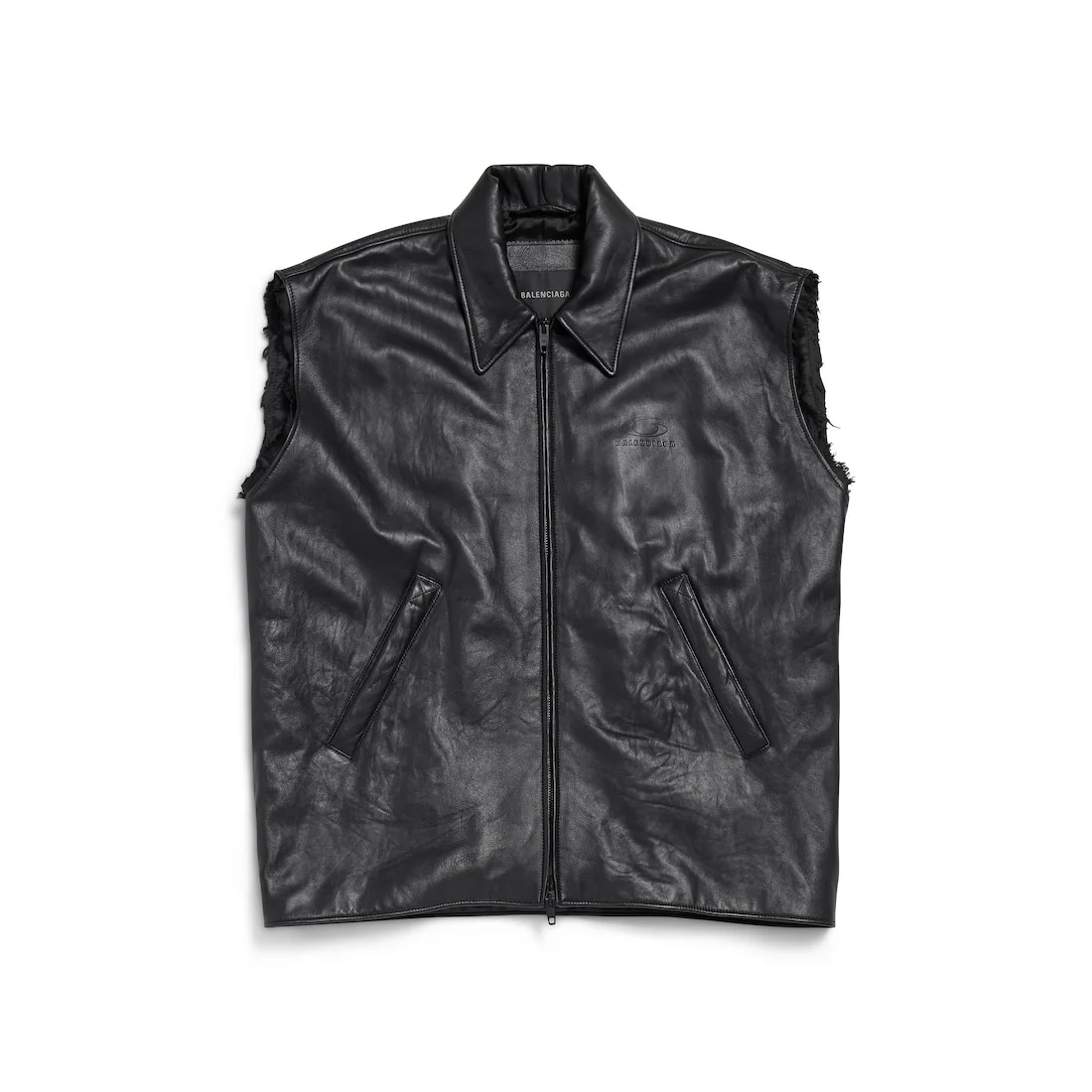 Sleeveless Bomber in black supersoft leather for Men PRODUCT DETAILS • Supersoft lambskin • Sleeveless • Raw cut at sleeves, visible lining • Double-ended zip fastening • 2 slash pockets at front • Loop Sports Icon artwork embossed on chest • Made in Italy Main material: Lambskin