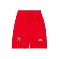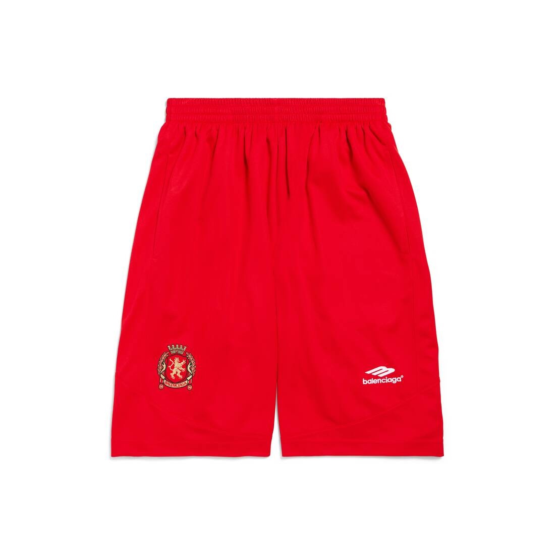 Soccer Baggy Shorts in red and white technical jersey PRODUCT DETAILS • Technical jersey • This item is unisex • Large fit • Mid-waist • Elasticated waistband • 2 slash pockets • Contrasting piping detail • Knee length • Football crest artwork embroidered on right leg • 3B sports icon artwork embroidered on left leg • Made in Portugal • Dry cleaning • The model is wearing a size S Material: 100% polyester