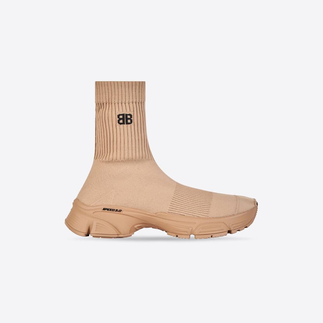 Speed 3.0 Sneaker in beige recycled knit, beige sole unit PRODUCT DETAILS • Technical ribbed 3D knit made of recycled polyester and elastane • Molded sole unit • Balenciaga logo on front outsole • BB logo on exterior knit • Speed 3.0 logo on exterior sole • Made in Italy • Wipe with a soft cloth Details: The upper of this product contains 80% polyester sourced from recycled existing objects. It therefore reduces waste and energy consumption during production phase, emits less CO2 and impacts biodiversity less. Our approach: We are committed to the sustainable and ethical management of our operations. The goal of reducing our environmental impact influences our decisions. At all levels and in all locales—whether at offices and stores or along the supply chain—we respect high standards for social and ecological responsibility. Balenciaga is also fur- and exotic leather-free. Material: 92% polyester, 8% elastane