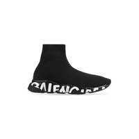 Speed Graffiti Sneaker in black knit, black and white graffiti printed sole unit PRODUCT DETAILS • Technical 3D knit • Ultra-flexible molded sole unit • "No Memory” sole technology • Extra light, nearly barefoot feel • Balenciaga graffiti logo in color contrast on sole • Made in Italy • Wipe with a soft cloth Material: 92% polyester, 8% elastane
