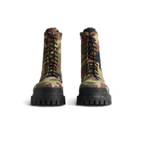 Strike 20mm Boot in dark green camo print on canvas PRODUCT DETAILS • Camo print on canvas • Boot • Extra round toe • Worn-out effect • 20mm arch • Inner zip • Visible tone-on-tone top-stitching • 11 eyelets lace-up vamp • Thick toothed rubber outsole with Balenciaga logo in the front and in the back • Loop at back • Made in Italy Material: cotton