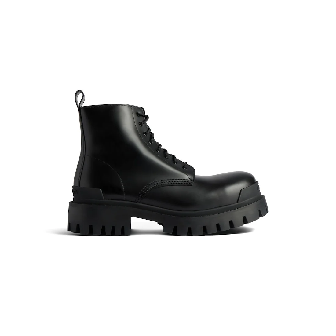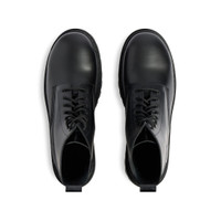Strike Lace-Up Boot in black mat calfskin PRODUCT DETAILS • Smooth mat calfskin • Extra round toe • 20mm arch • Mid-calf height • Tone-on-tone laces • Visible tone-on-tone top-stitching • 8 eyelets lace-up vamp • Thick toothed rubber outsole • Loop at back • Made in Italy • Wipe with a soft cloth Material: 100% calfskin