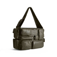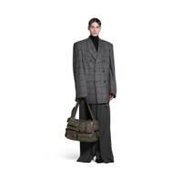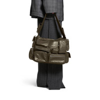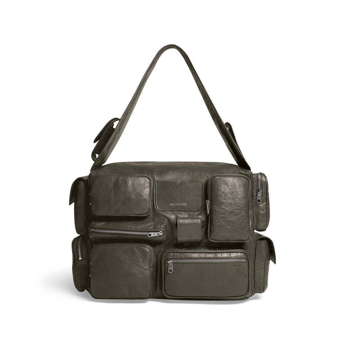 Superbusy Large Sling Bag in dark green Arena lambskin, aged-silver hardware PRODUCT DETAILS • Dimensions: L16,5 x H11,4 x W7,4 inch • Arena lambskin • Sling bag • Shoulder strap with 1 hook Balenciaga logo engraved (14,1 inch) • Balenciaga logo embossed at front • Aged-silver hardware • Double end zipped closure • 1 main compartment • 2 pockets on strap • 5 zipped pockets at front • 1 card holder at front • 1 EarPods case to fit AirPods Pro at front • 2 flap pockets and 2 zipped pockets on sides • 1 zipped pocket at back • 1 back hook • BB logo engraved on zip puller • Cotton canvas lining • Made in Italy • Wipe with a soft cloth Material: 95% lambskin, 5% polyester