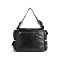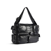 Superbusy Large Sling Bag in black Arena lambskin with piercings, aged-silver hardware PRODUCT DETAILS • Dimensions: L16,5 x H11,4 x W7,4 inch • Arena lambskin with piercings • Sling bag • Shoulder strap with 1 hook Balenciaga engraved (14,1 inch) • Balenciaga logo debossed with silver foil at front and back • Aged-silver hardware • Double end zipped closure • 1 main compartment • 2 pockets on strap • 5 zipped pockets at front • 1 card holder at front • 1 EarPods case to fit AirPods Pro at front • 2 flap pockets and 2 zipped pockets on sides • 1 zipped pocket at back • 1 back hook • BB logo engraved on zip puller • Cotton canvas lining • Made in Italy lambskin, brass, polyamide