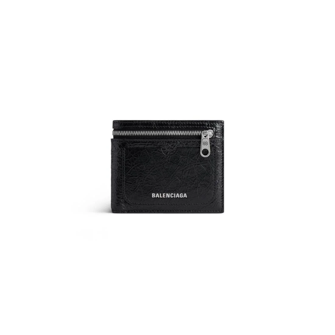 Superbusy Square Folded Wallet in black Arena lambskin PRODUCT DETAILS • Dimensions: L4,5 x H3,9 x W1 inch • Arena lambskin • Square folded wallet • Balenciaga logo debossed with silver foil at front • Aged-silver hardware • 1 large zipped pocket on the exterior • 1 card slot at front • 1 flap pocket at back • 8 inner card slots • 2 inner bill pockets • 2 inner receipt compartments • Made in Italy lambskin