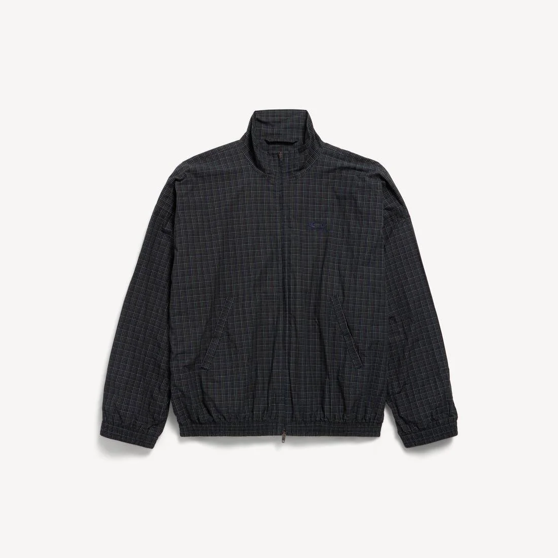 Tailored Tracksuit Jacket in navy and dark green micro tartan poplin PRODUCT DETAILS • Technical cotton with micro tartan pattern • High neck • Double-ended zip fastening • Long sleeves • 2 snap-button slash pockets • Gathered cuffs and waistline • Loop sports icon artwork embroidered on chest • Made in Italy Main material: 100% cotton