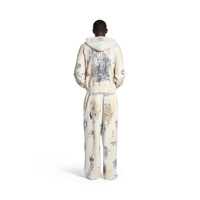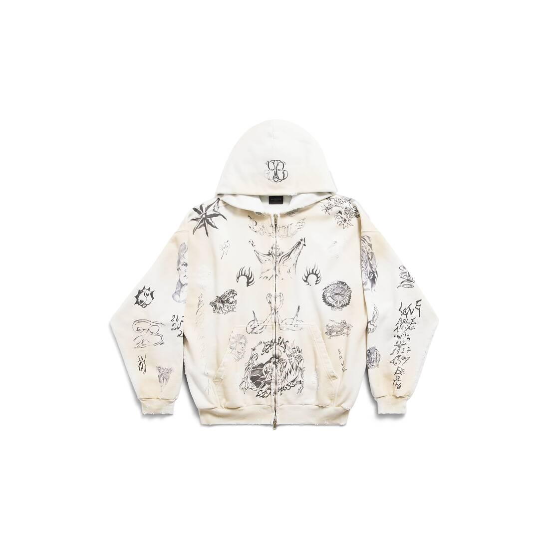 Tat Zip-Up Hoodie Medium Fit in off white and black heavy fleece is from look 76 of Balenciaga Summer 24 Collection. PRODUCT DETAILS • Heavy fleece • This item is unisex • Medium fit • Hood without drawstring • Dropped shoulders • Double-ended zip fastening • 2 pockets at front • Gathered at cuffs and waistline • Tat artwork printed throughout • Destroyed and dirty effect • Made in Portugal • Dry cleaning Material: 100% cotton