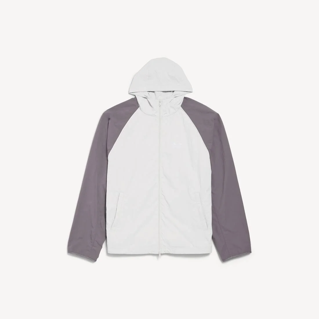 Technical Tracksuit Jacket in light grey cotton polyamide PRODUCT DETAILS • Technical polyamide • Hooded design • High neck • Double-ended zip fastening • Long raglan sleeves • 2 zipped slash pockets • 2 inner vertical zipped pockets • Loop sports icon artwork embroidered on chest • Adjustable drawstring at hem • Elasticated cuffs • Made in Italy Main material: 100% polyamide