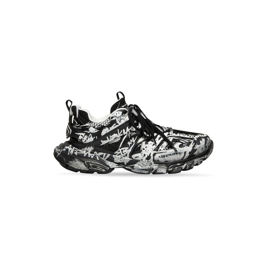 Track Graffiti Sneaker in black and white mesh and nylon PRODUCT DETAILS • Leather free • Sneaker • Mesh and nylon • Dirty effect • Graffiti printed in color contrast on sole and upper • Written size at the edge of the toe • Track embossed at the back of the heel • BB embossed on front of the outsole • Printed logo on the exterior • Embossed logo on the tongue • Double laces knotted in a usual equipment way • Back pull-on tab and tongue pull-on tab • Dynamic sole design with an augmented back for more comfort • 1 additional pair of laces included • Made in China • Wipe with a soft cloth Material: 75% polyurethane, 21% polyester, 4% nylon